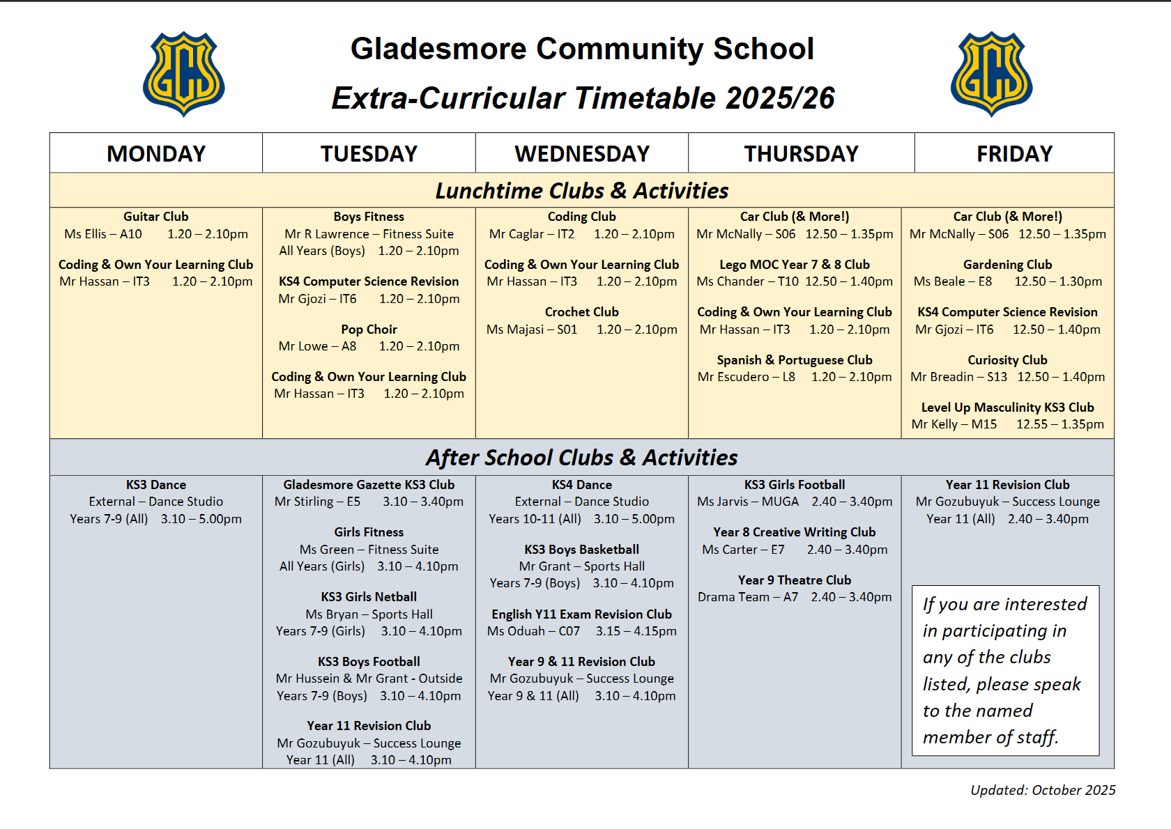 Gladesmore Community School likes to think of itself as a family and, as such, we recognise that our pupils have individual needs and interests. We try to provide many opportunities for our pupils as we can so that they can explore new interests, gain a breadth of knowledge and skills that widen their understanding of the world and prepare them for their future.
